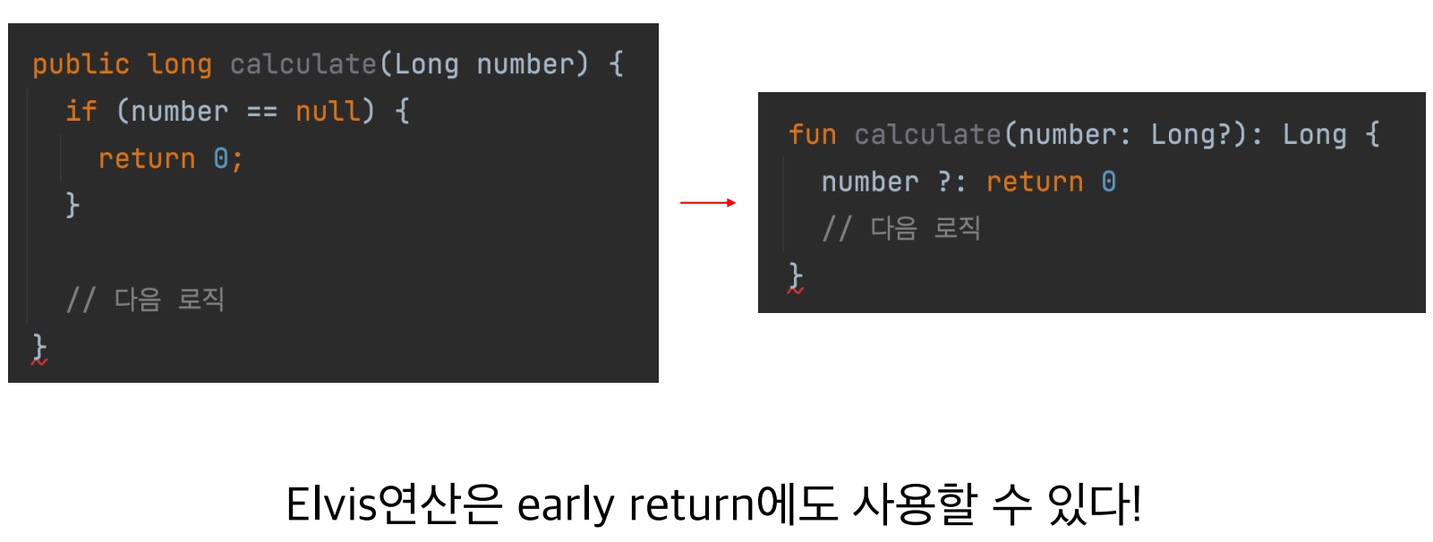 null이 아니라면 ?: 앞의 값을 반환해준다. 즉 Elvis 연산자가 없었던것처럼 동작한다. (?: 뒤에는 동작하지않는다 )