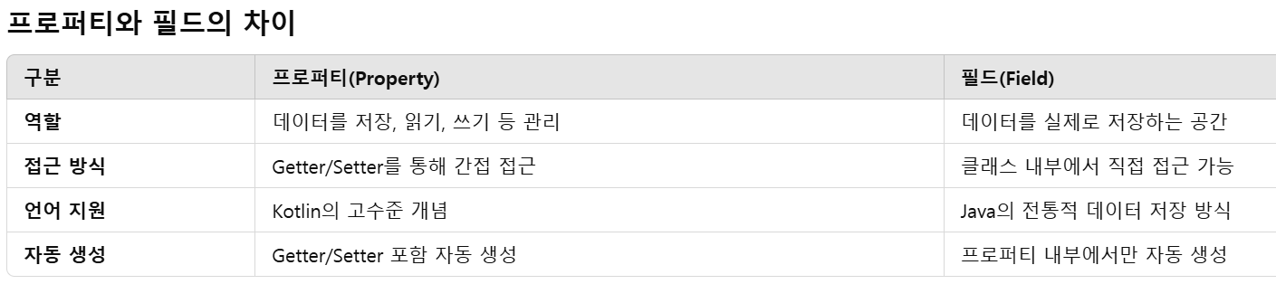 - Kotlin에서는 기본적으로 프로퍼티를 사용하며, 개발자가 직접 필드를 정의할 필요가 거의 없습니다.
