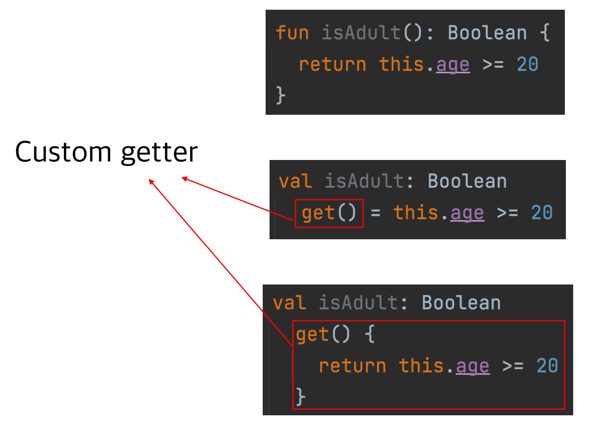 isAdult라는 프로퍼티를 val(자바에서 final, read-only,읽기전용)으로 만들어서 isAdult라는 프로퍼티에 어떤값도 저장되지않게 만든다.