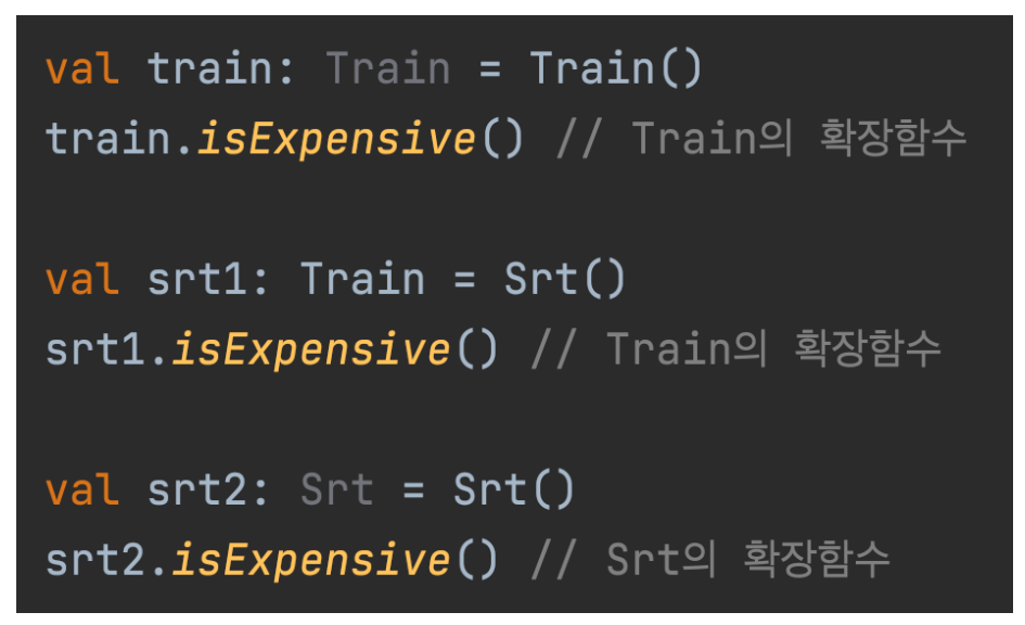 즉, 정적인 타입에 의해 어떤 확장함수가 호출될지 결정된다.