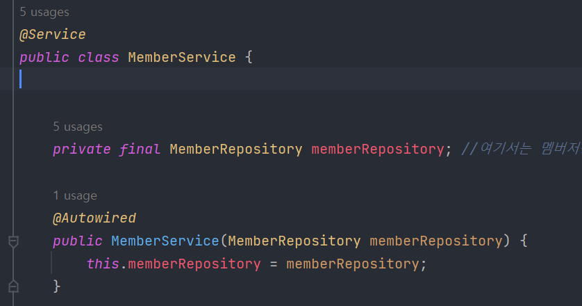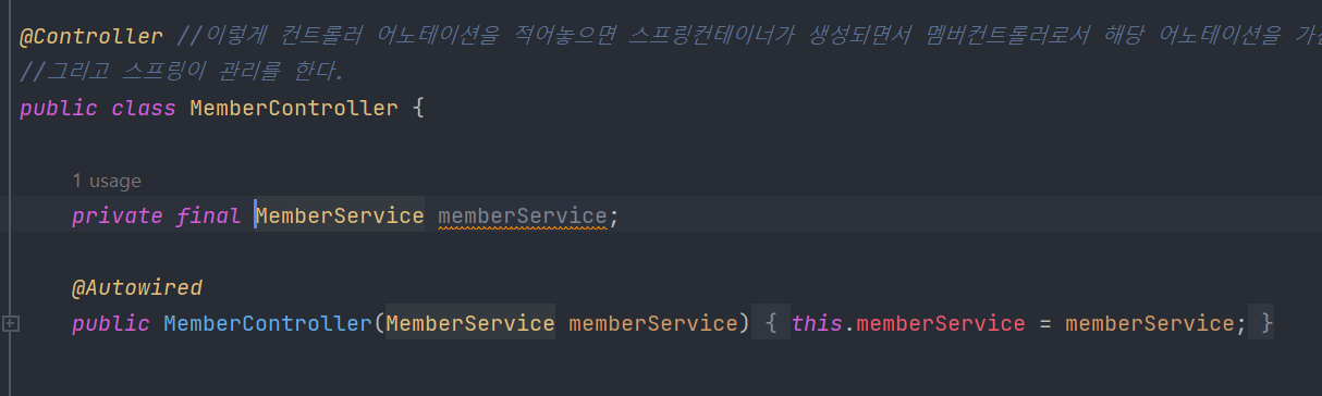이제 MemberController에서 MemberService를 생성해서 그안에 있는 메소드들을 사용해야하는데