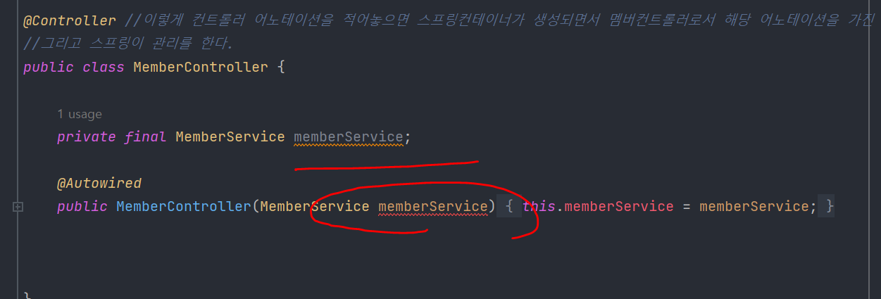 @Autowired가 붙어있다면 MemberController가 생성될때 전달인자인 memberSerivce는 스프링컨테이너에 있는 memberService로 전달해서 생성해준다.