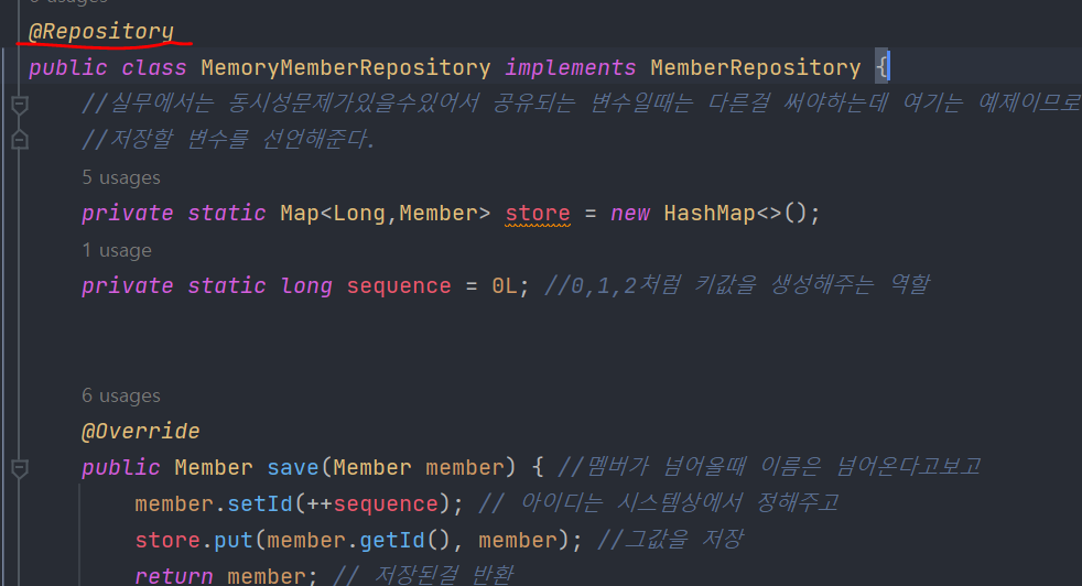 이렇게 컨트롤러 어노테이션을 적어놓으면 스프링컨테이너가 생성되면서 멤버컨트롤러로서 해당 어노테이션을 가진 컨트롤러를 넣어놓는다.