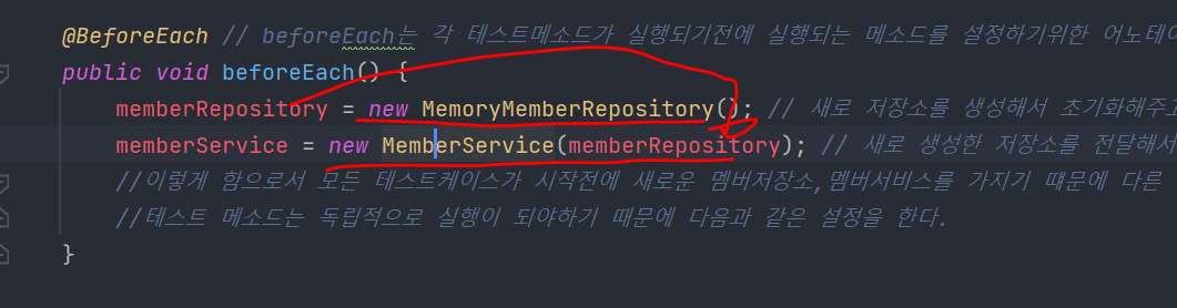 멤버서비스에 넣어줘야하는 멤버리포지토리를 생성해서 넣어준 이부분을 이야기하는거 같다.