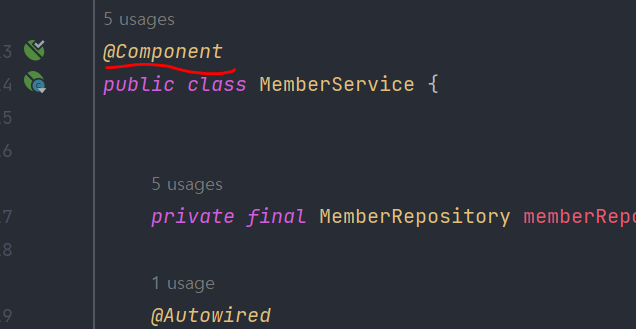 @Serivce 어노테이션이 없었기 때문 , 이 어노테이션이 없다면 멤버서비스는 그냥 자바파일일 뿐이다.
