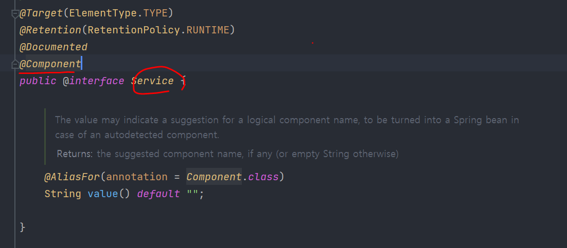 하지만 @Service를 대신넣어도 되는이유는 Service의 내부를 살펴보면 알 수있다.