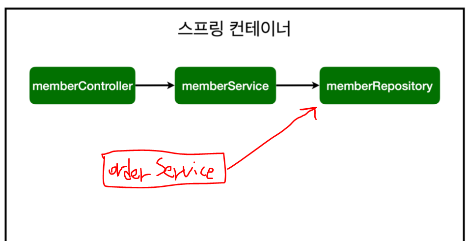 예시로 만약에 OrderSevice를 스프링빈으로 등록했고 Autowired를 통해 멤버리포지토리를 생성자의 매개변수로 사용한다면 다음과 같은 상황이 될것이다.