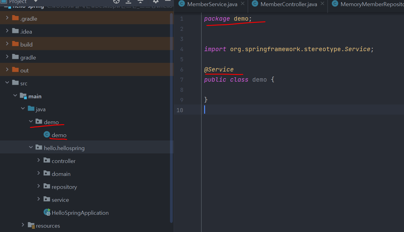 이렇게 demo 패키지를 java밑에 생성해서 demo 자바파일을 만들고 @Service 어노테이션을 사용해보았다.