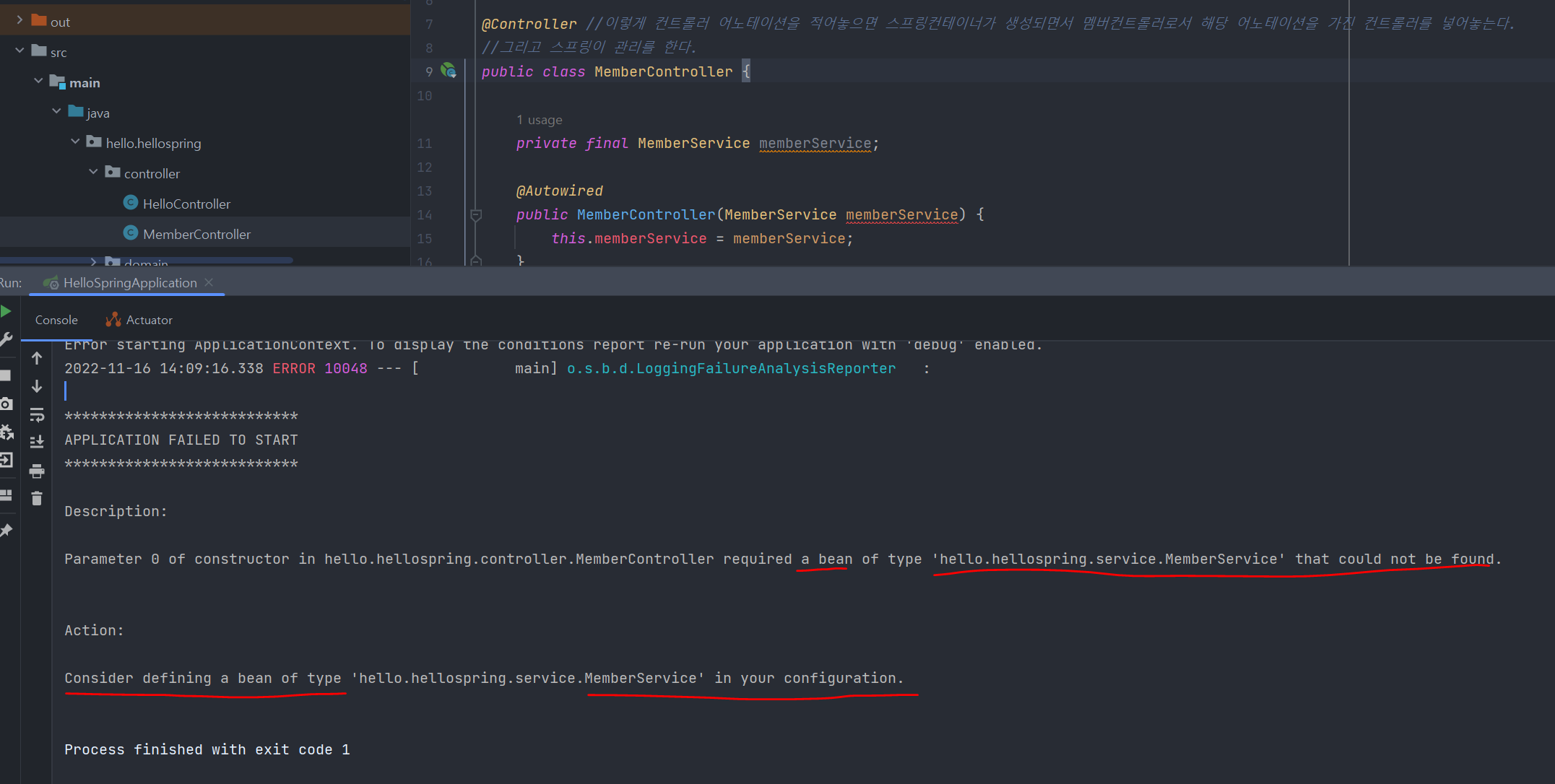 그리고 내가 직접 멤버서비스를 생성해준다고 해도 @Autowired가 동작하지않는다.