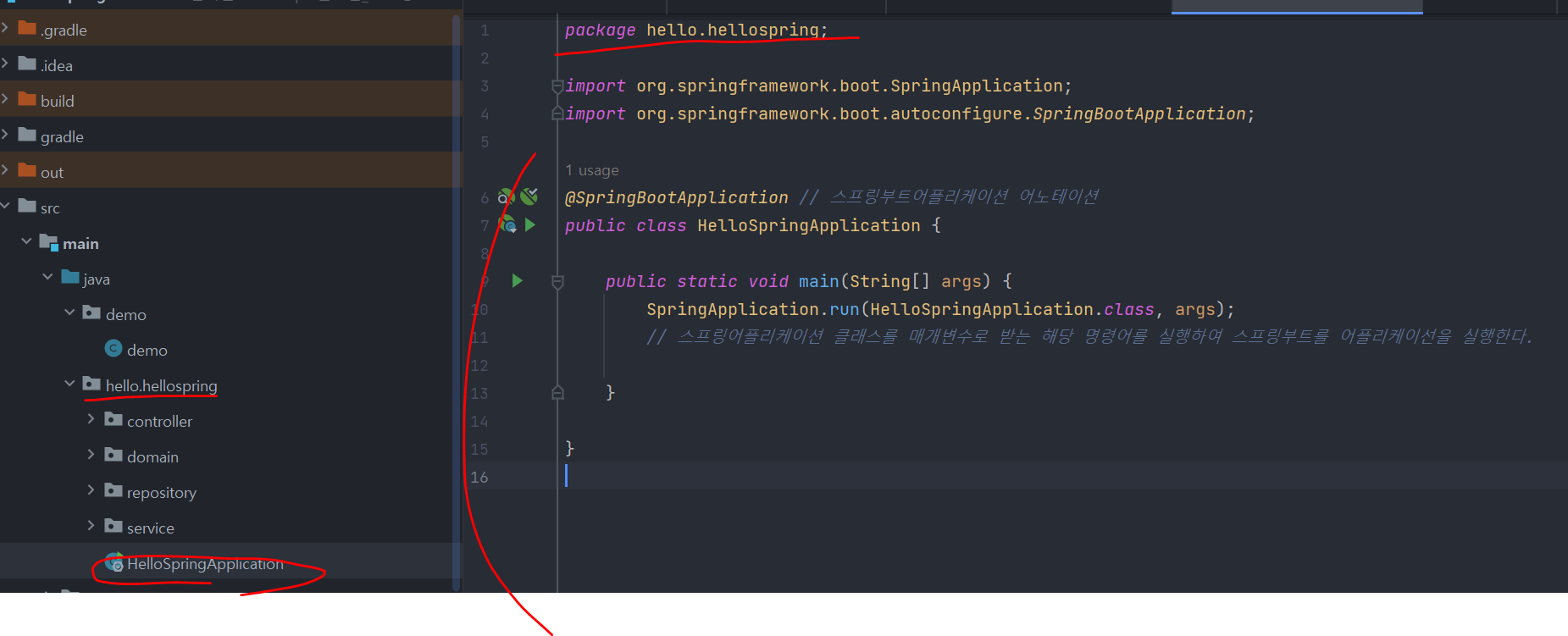 HelloSpringApplication은 현재 hello.hellospring 패키지내부에 있으므로