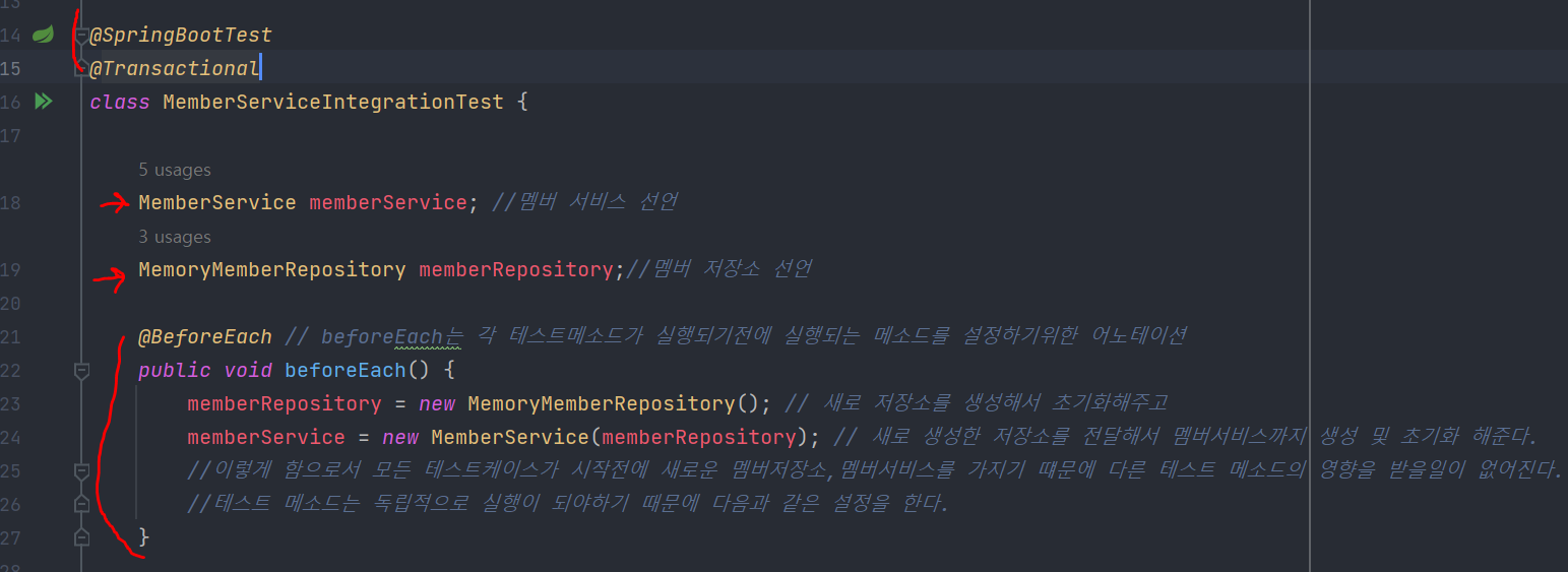 //이렇게 함으로서 모든 테스트케이스가 시작전에 새로운 멤버저장소,멤버서비스를 가지기 떄문에 다른 테스트 메소드의 영향을 받을일이 없어진다.