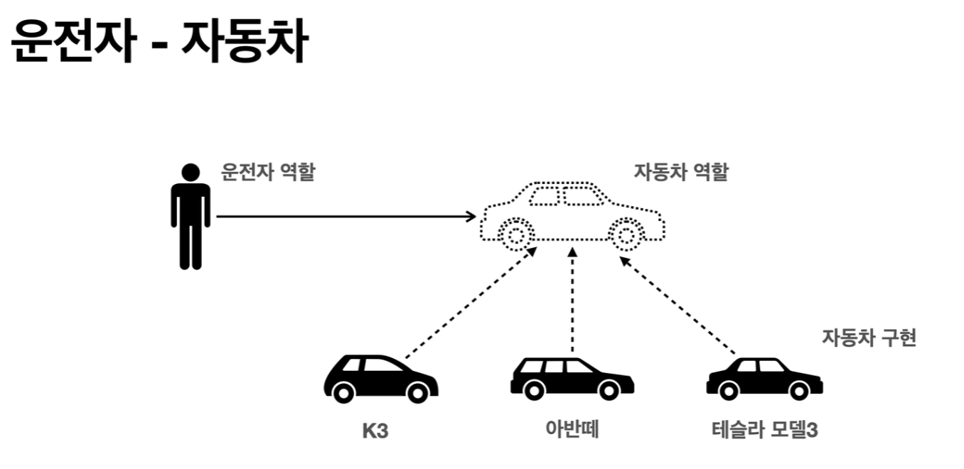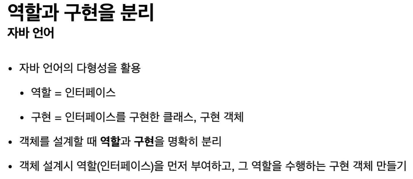 여기서 역할은 인터페이스이고 구현은 인터페이스 객체 (구현체)를 의미한다.