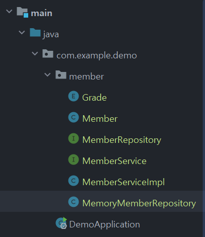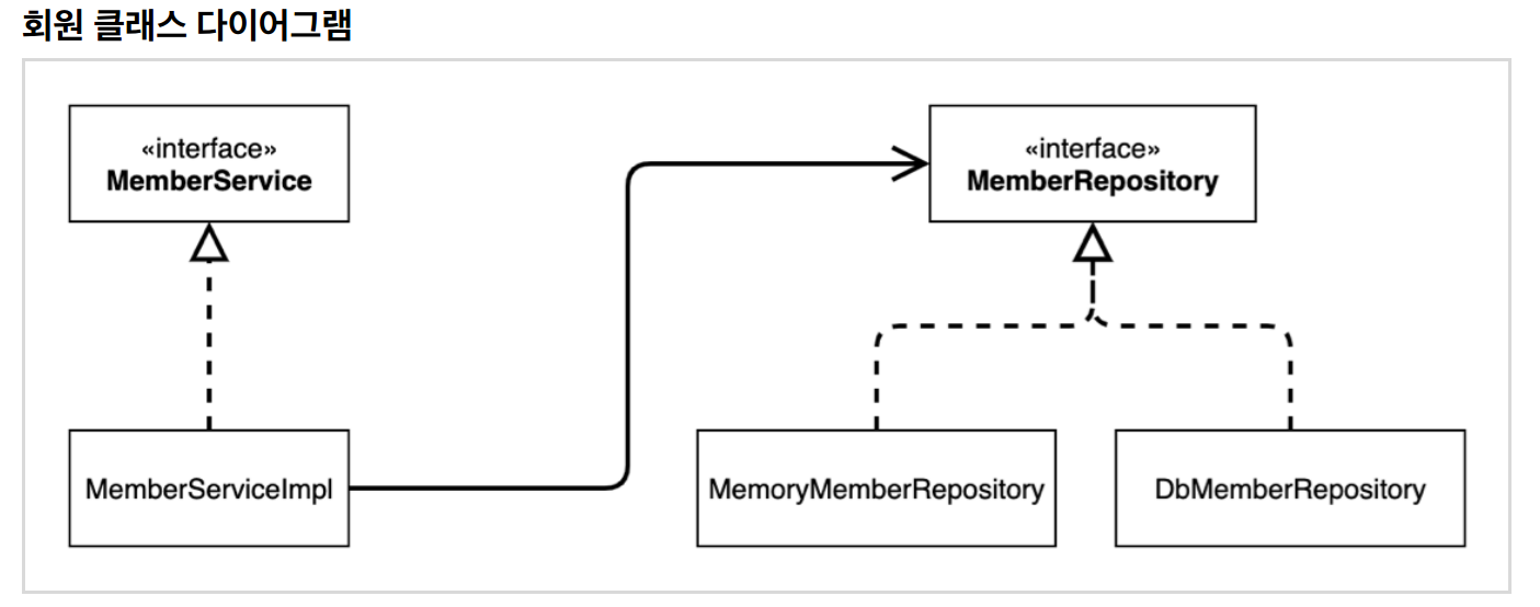 멤버리포지토리(역할)을 인터페이스로 만들고 메모리멤버리포지토리,DB멤버리포지토리를 구현체로 구현할 예상을 한다.(리포지토리는 미정이므로)