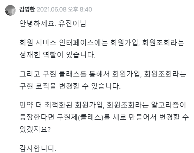 멤버서비스는 왜 인터페이스로 구현할까?에 대한 김영한님 대답