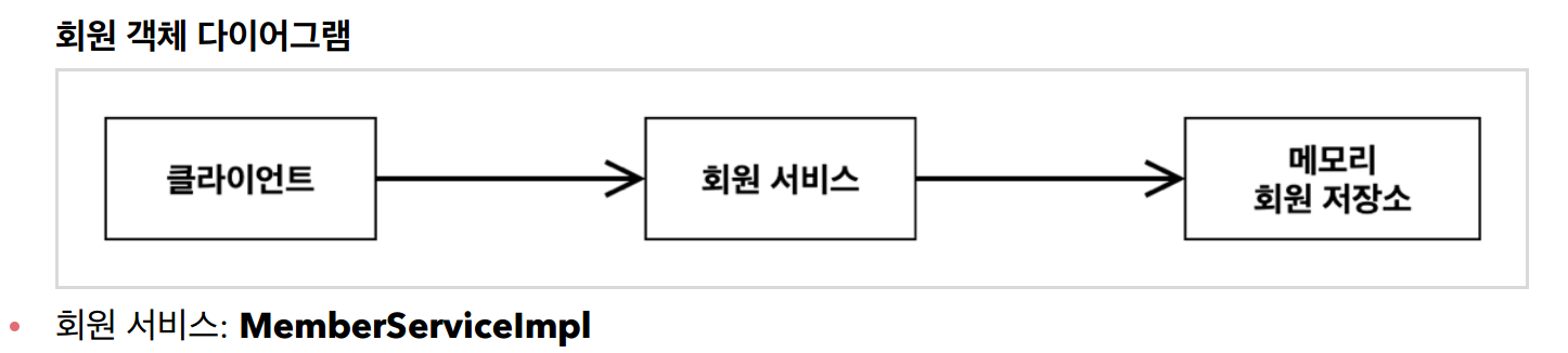클라이언트 객체는 회원서비스구현체 객체를 바라보고 회원서비스구현체 객체는 메모리회원 저장소 구현체 객체를 바라본다.
