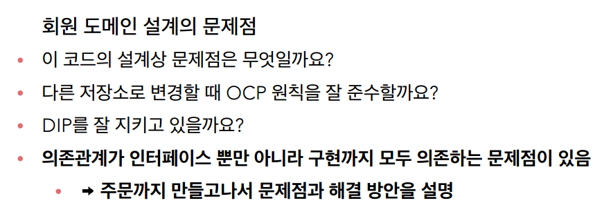 추상화(멤버리포지토리 인터페이스)에도 의존하고 , 구체화(메모리멤버리포지토리)에도 의존하는 문제점 ->DIP 위반