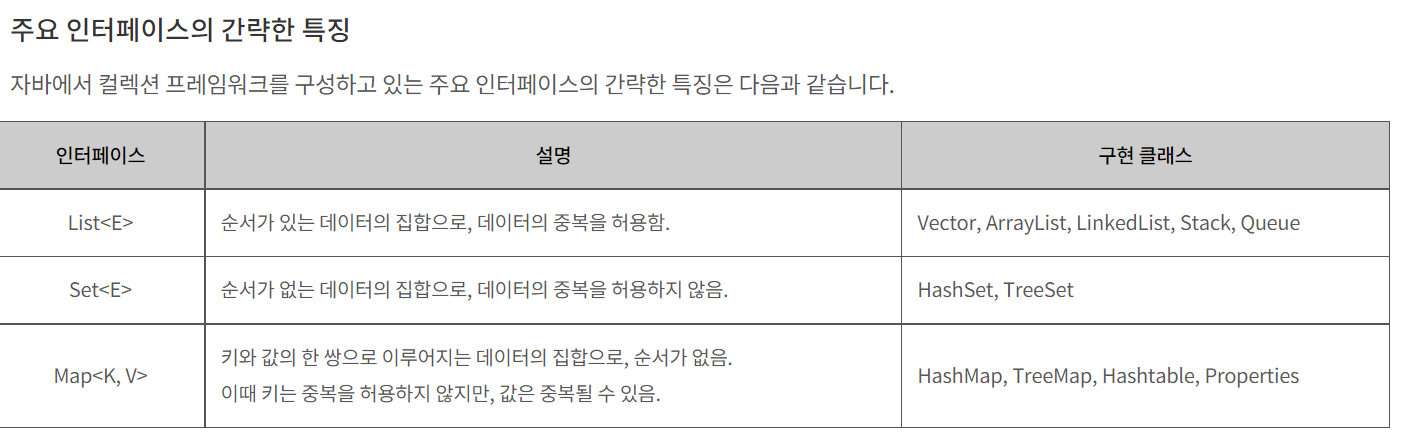 이러한 컬렉션 프레임워크는 자바의 인터페이스(interface)를 사용하여 구현된다.