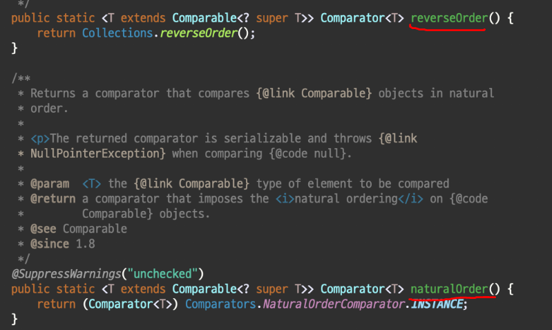 naturalOrder() 메소드와 reverseOrder()는 미리 구현된 메소드라는것이다 (앞에 static이 붙어있는걸 보면 알수 있다.)