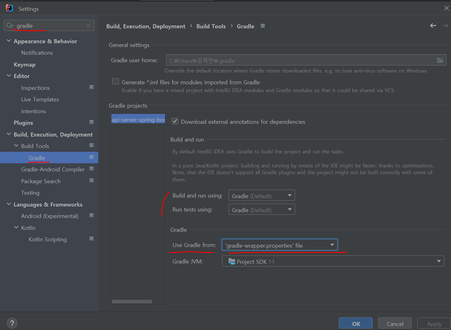 2부분은 gradle로 바꿔줬다. 이 부분에서 해당 오류를 발생시킨다. gradle을 인텔리제이로 다시바꿔준다면 오류가 해결될것이다. (나같은경우 오류가 인텔리제이에서 발생하지않고 , ec2 서버인 ubuntu에서 오류가 발생하였음)