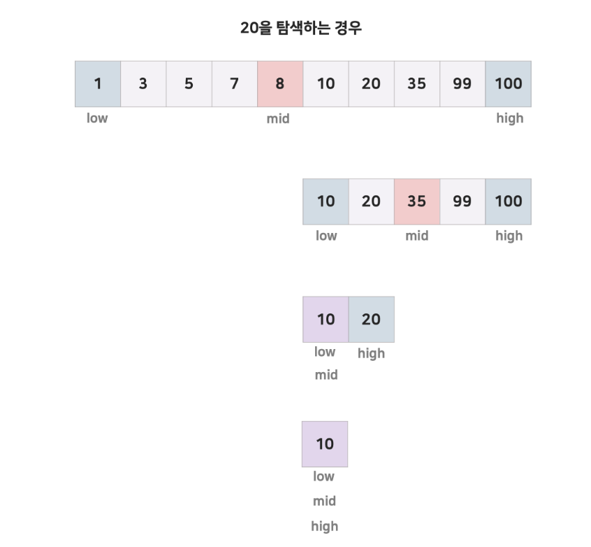 - 찾고자 하는 값이 속해있지 않은 부분은 전혀 고려할 필요가 없기 때문에, 매 단계에서 검색해야 할 리스트의 크기를 반으로 줄일 수 있다.