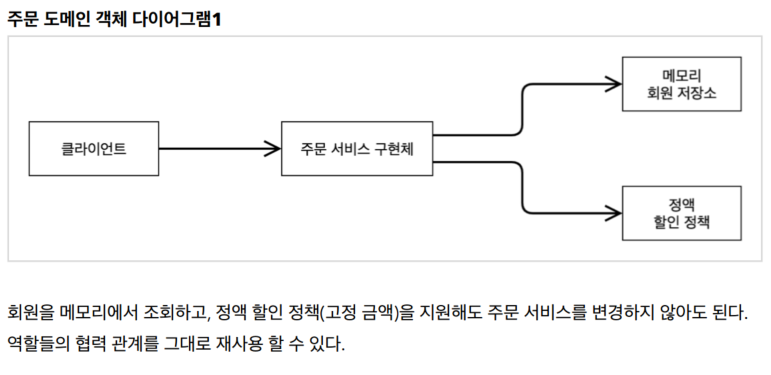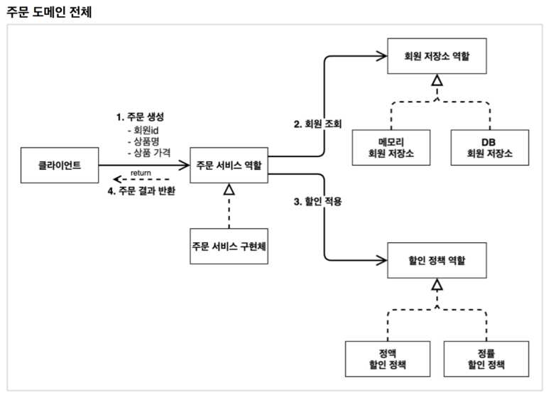 주문 생성 요청이 오면, 회원 정보를 조회하고, 할인 정책을 적용한 다음 주문 객체를 생성해서 반환한다.