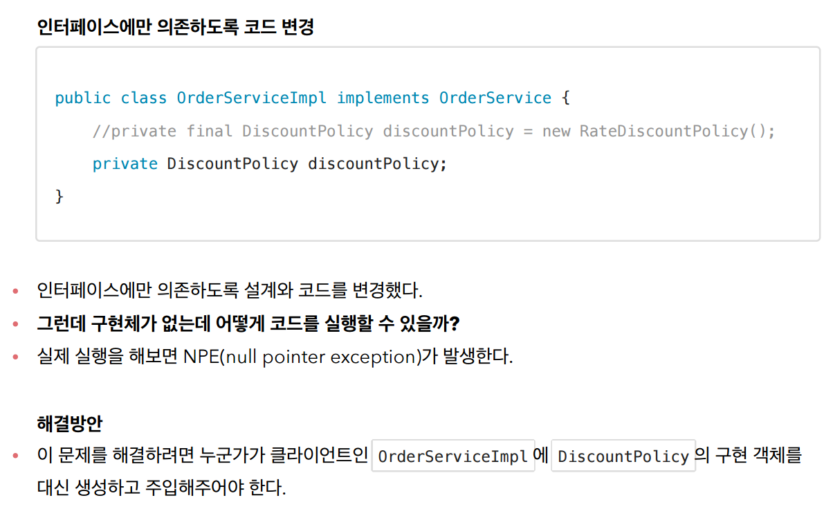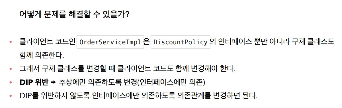 DiscountPolicy의 구현체를 바꾸려는데 OrderServiceImpl의 코드(클라이언트 코드)까지 수정이 필요함 -> 문제점