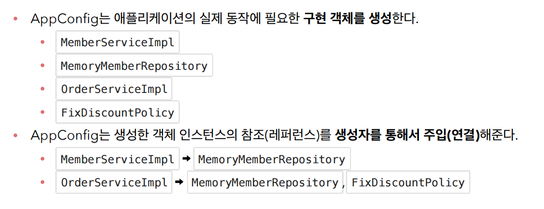 AppConfig가 멤버서비스구현체를 만들기전에 , 매개변수로 필요한 메모리멤버구현체를 생성한다. (생성)