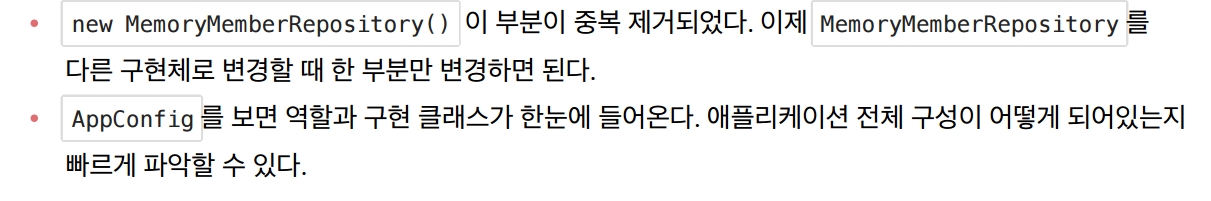 ex) 메모리 리포지토리 에서 DB리포지토리로 바꾼다고 했을때 return new DB리포지토리로 단 한줄만수정하면된다.