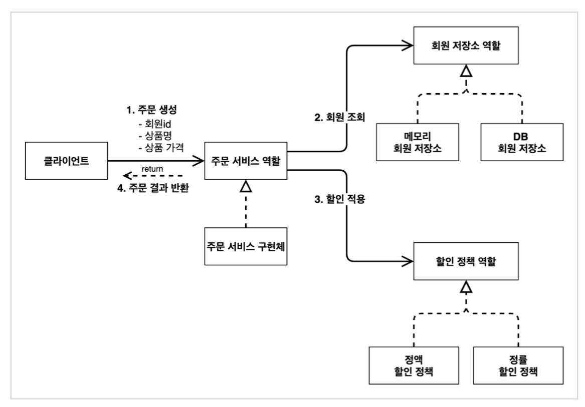 DIP도 준수 (추상화에 의존하고, 구체화에 의존하지않는다 -> AppConfig에서 의존성 주입을 해줘서 추상화에만 의존하면된다. 구현체는 외부에서 의존관계를 주입해줌)