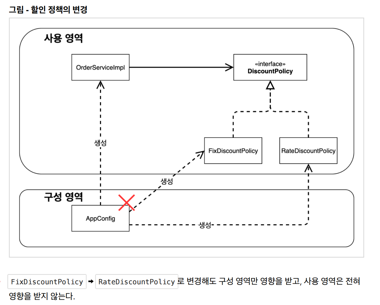 OCP도 준수 (확장에는 열려있고 변경에는 닫혀있다 -> 구현체변경을 할때 사용영역의 코드 수정은 없고 구성영역의 코드 수정만 필요하다 ( AppConfig를 사용함으로서) [클라이언트 코드 수정이 불필요]