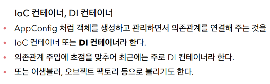 요즘에는 DI 컨테이너로 많이 불린다. [ == 의존관계 주입을 해주는 컨테이너]