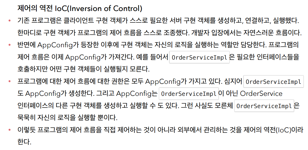 프로그램에 대한 제어 흐름 권한은 모두 AppConfig가 가지고 있다. 심지어 오더서비스임플(클라이언트 객체)도 AppConfig가 생성한다. AppConfig는 오더서비스임플이 아닌 다른 인터페이스 구현객체를 생성하고 실행할 수 있다.