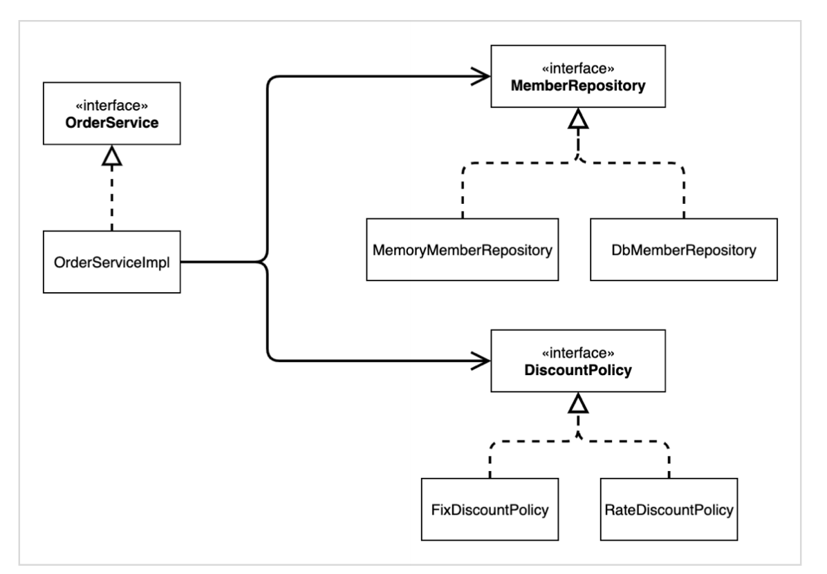 ex) 멤버서비스임플 구현체는 이제 그안에서 필요한 객체를 직접 생성하지않고 인터페이스 변수를 생성하여