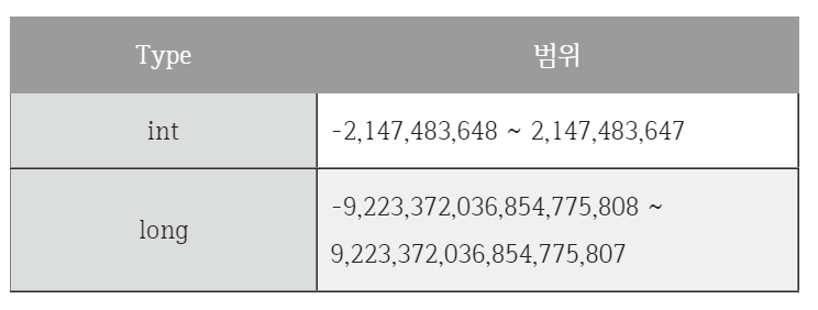 int나 long과 같은 자료의 범위가 다음과 같다. 저 범위를 넘어서면 모두 0으로 출력된다.